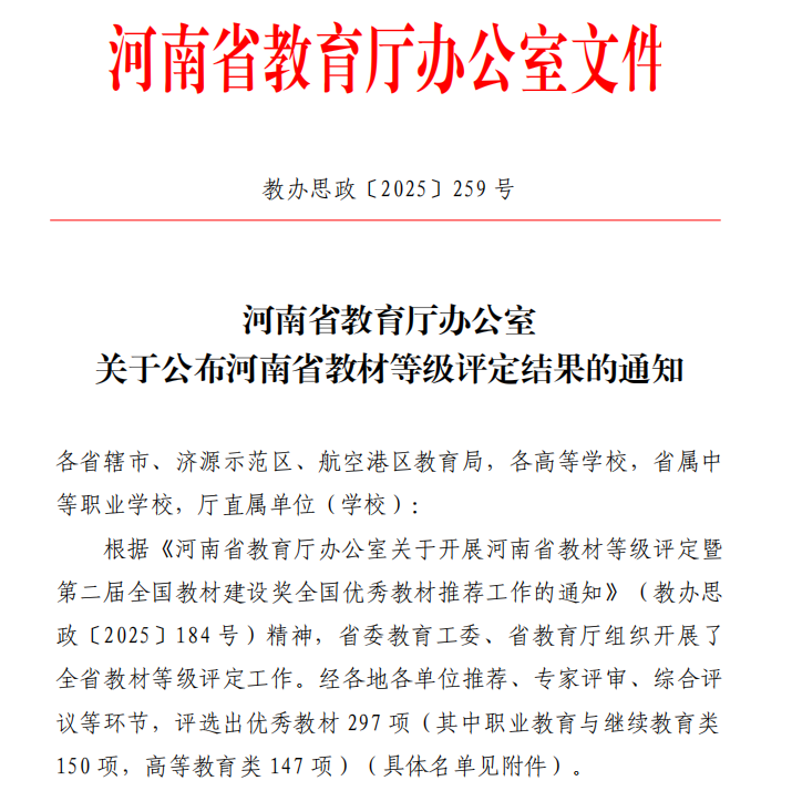 喜报!我校教材荣获河南省教材等级评定 一等奖