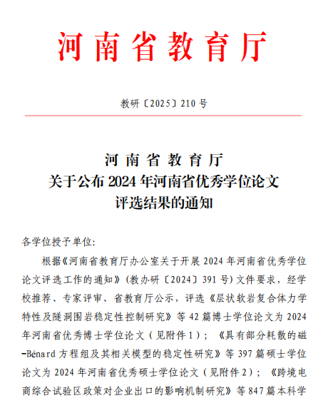 近日,河南省教育厅印发《关于公布2024年河南省优秀学位论文评选结果的通知》(教研〔2025〕210号),经学校择优推荐、专家严格评审及结果公示等多轮遴选,我校学子共有8篇本科毕业论文(设计)荣获“2024年河南省优秀学士学位论文”,这一成绩充分彰显了我校在应用型本科人才培养与教育教学质量方面的扎实基础和显著成效。