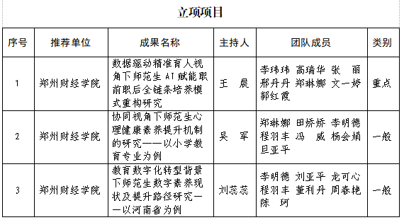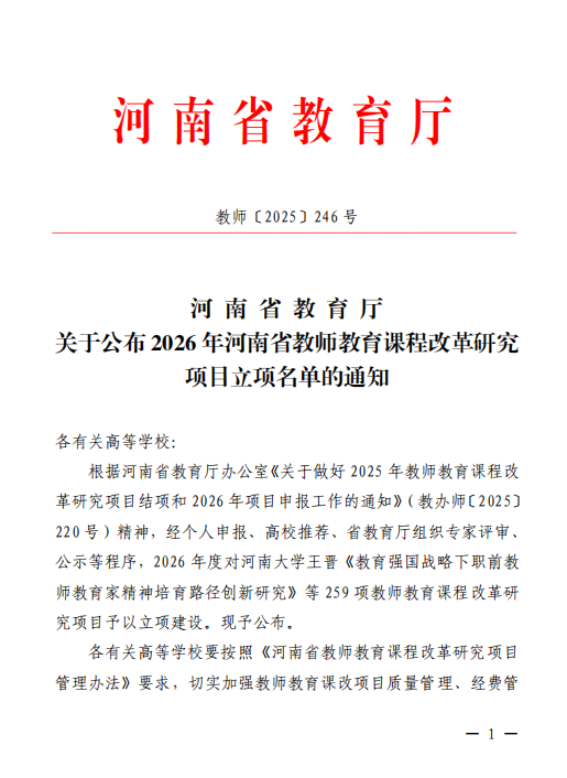 近日,河南省教育厅发布《关于公布2026年河南省教师教育课程改革研究项目立项名单的通知》(教师〔2025〕246号),我校申报的3个项目全部获批立项。