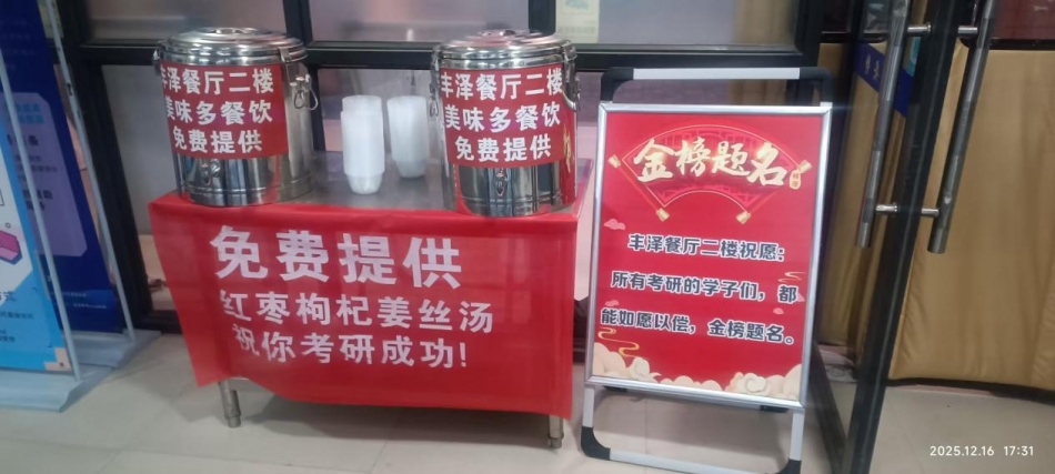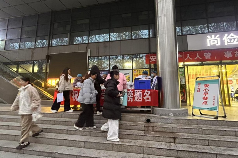 面对考试期间低温天气,学校积极开展“温暖研考”服务。提前开放教学楼空调,提供免费红糖姜茶、爱心早餐;组织志愿者协助引导、保管物品;通过官网、微信公众号等平台多次发布温馨提示,清晰说明考场规则、交通指引及天气预警,及时回应考生咨询,传递有温度的服务理念。