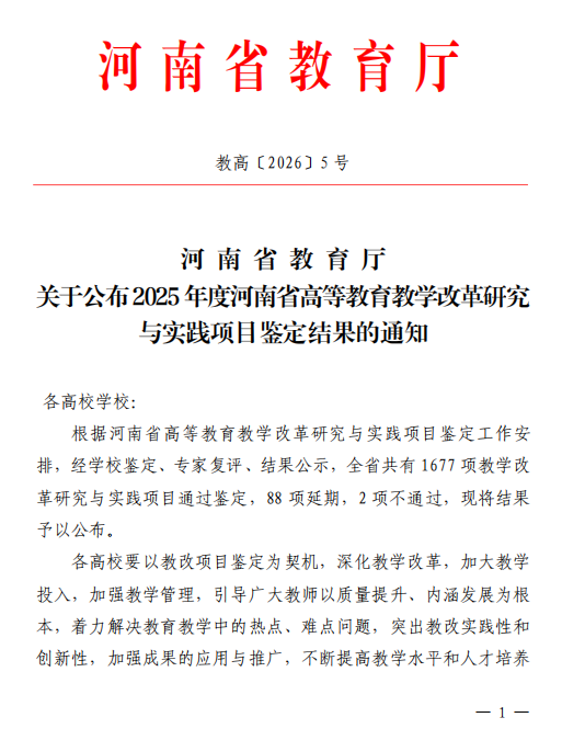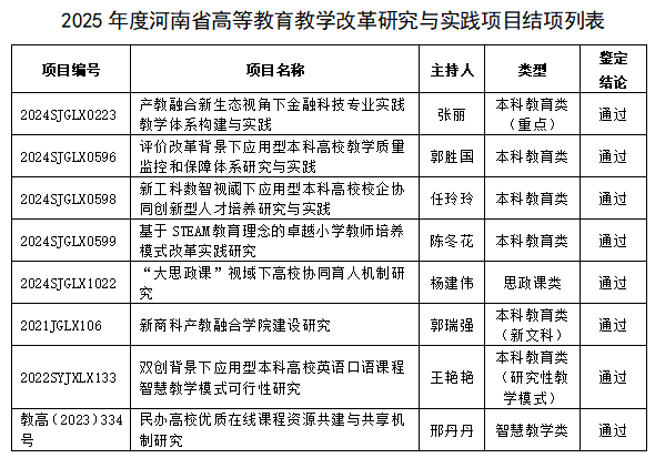 近日,河南省教育厅公布了2025年度高等教育教学改革研究与实践项目鉴定结果,我校共有8个项目顺利通过结项验收。这些项目覆盖本科教育、思政课程、智慧教学等多个类别,集中体现了我校在深化教育教学改革、推动内涵式发民展方面的坚实步伐与持续探索。